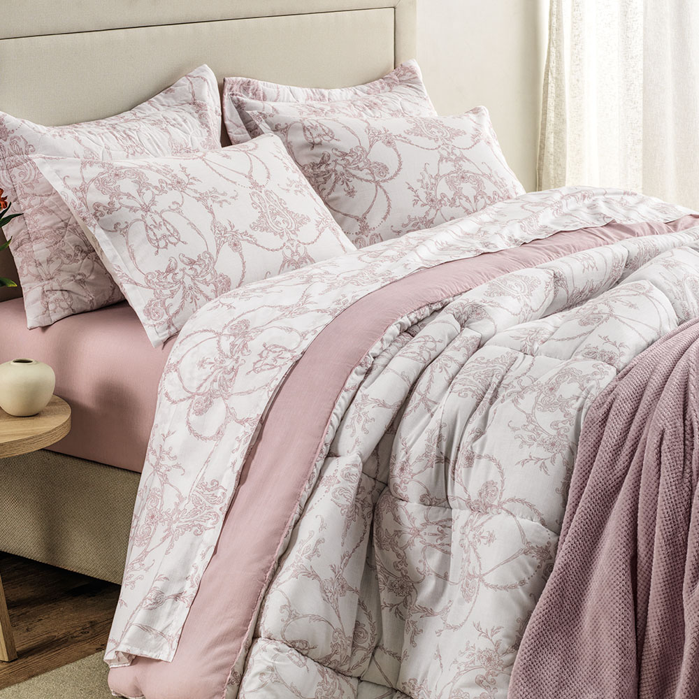 Casal: 1 Lençol de elástico 1,38m x 1,88m x 30cm, 1 Sobre lençol 2,20m x 2,40m, 2 fronhas 50cm x 70cm sem abas.